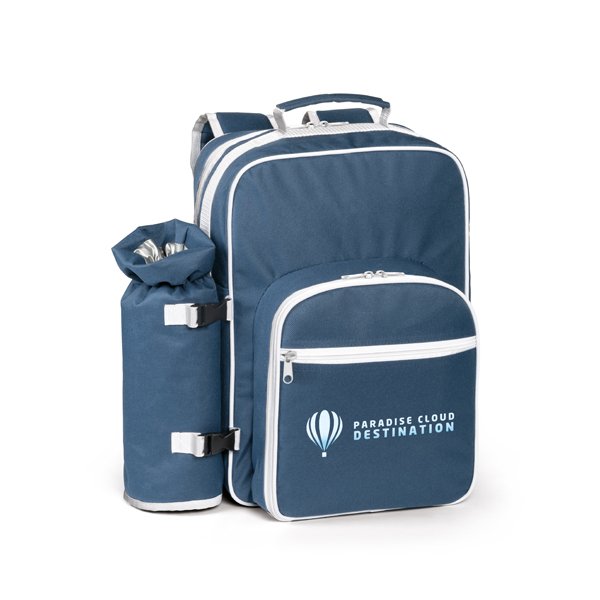 Bolso frontal forrado com 210D e almofadado. Inclui 6 talheres em aço inoxidável (2 garfos, 2 facas e 2 colheres), 2 pratos, 2 copos em PS e 1 saca-rolhas.