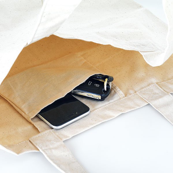 Algodão canvas: 280 g/m². Com bolso interior e alças de 65 cm. 450 x 380 x 105 mm